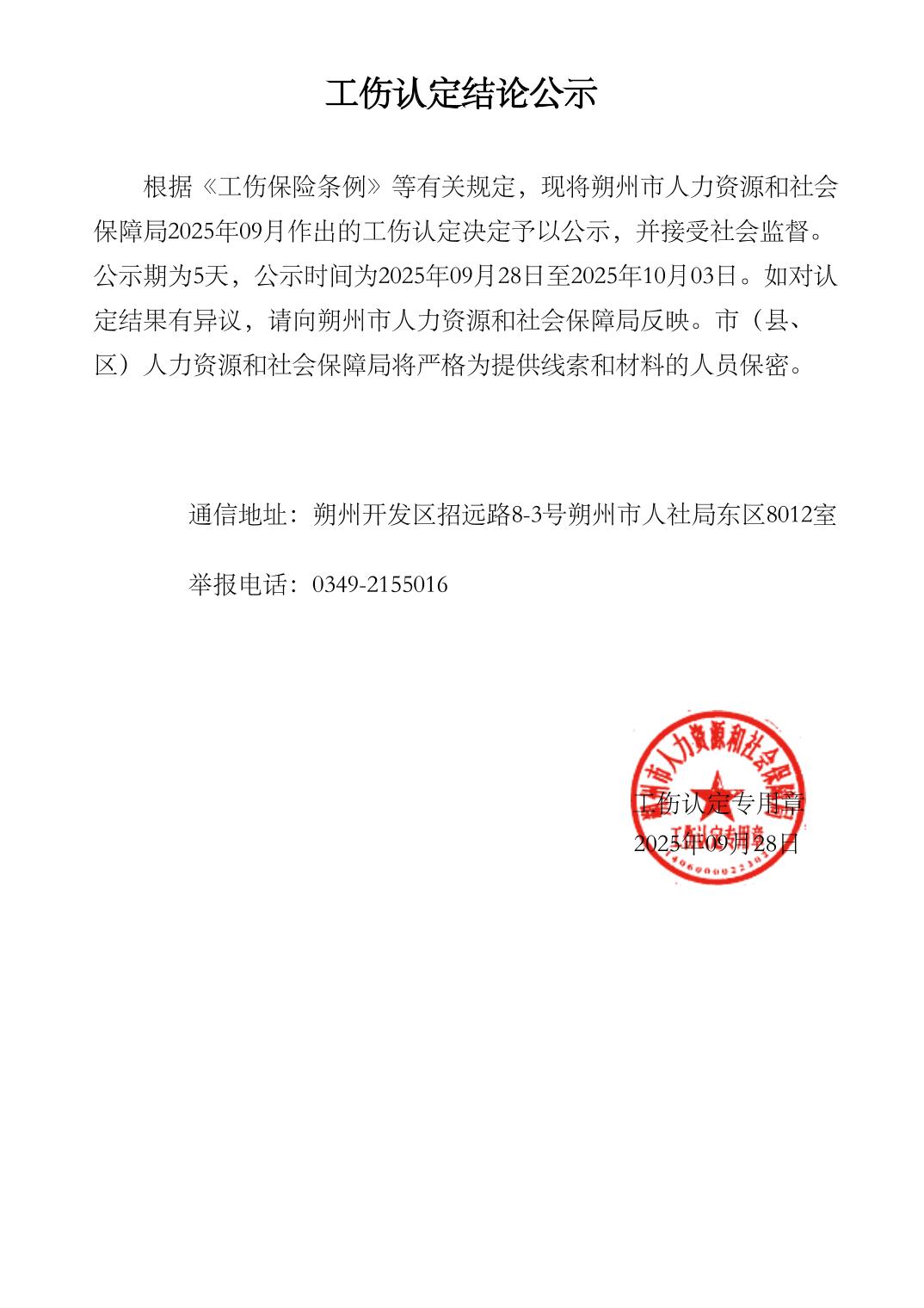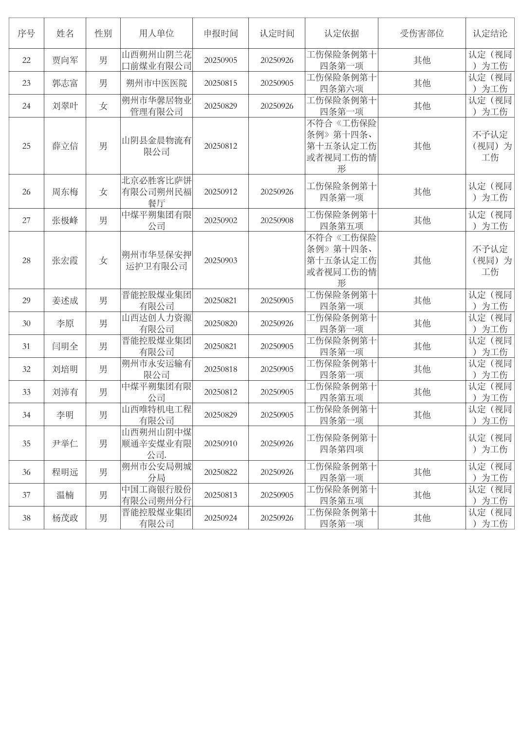 2025年9月份工傷認定決定公示